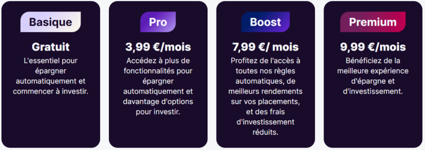 • Les plans Pro / Boost / Premium donnent accès à plus de fonctionnalités, d’ETF/actions/crypto, et à des frais d’investissement réduits.