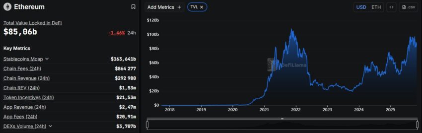 ✅ Ethereum est au cœur de l’éco-système crypto, notamment depuis qu’elle a démocratisé les smart contracts. Résultat, sa Total Value Locked (TVL) s’élève à plus de 85 milliards de dollars en octobre 2025 :