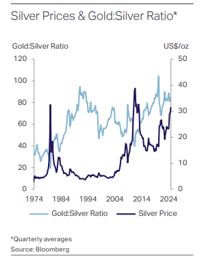 📈 Enfin, pour les investisseurs en quête de rentabilité, l’argent est traditionnellement plus volatile que l’or, et donc potentiellement plus rémunérateur pour ceux qui savent exploiter les mouvements de marché. La question, compliquée, est alors de savoir s’il est encore temps de rentrer sur le marché de l’argent malgré son prix déjà relativement élevé. Or sur ce point, les experts analysent le ratio or / argent pour déterminer si l’un est sous évalué par rapport à l’autre. Pendant les 9 premiers mois de 2025, l’or coûtait environ 90 fois plus cher que l’argent. Il s’agissait d’un ratio plutôt élevé historiquement, faisant dire aux experts que l’argent était sous évalué. Avec la récente hausse de l’argent, l’or n’est plus que 66 fois plus cher. L’opportunité est-elle passée ? Pas forcément, dans la mesure où en 2011 le ratio or / argent fut inférieur à 35 quelques jours.